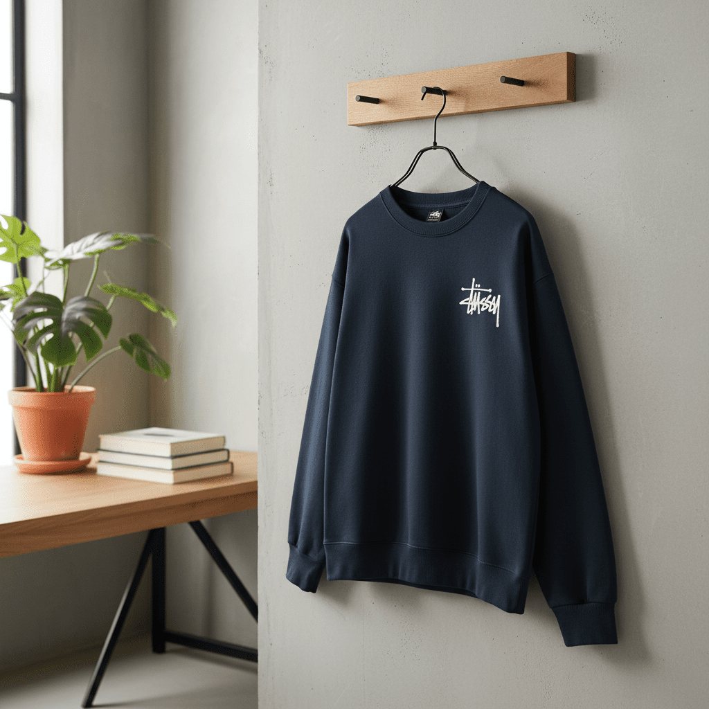 Stussy Navy Blue Crewneck Sweatshirt made of soft cotton, featuring iconic graffiti logo on front and English text design on back. Unisex streetwear style for everyday comfort and individuality.