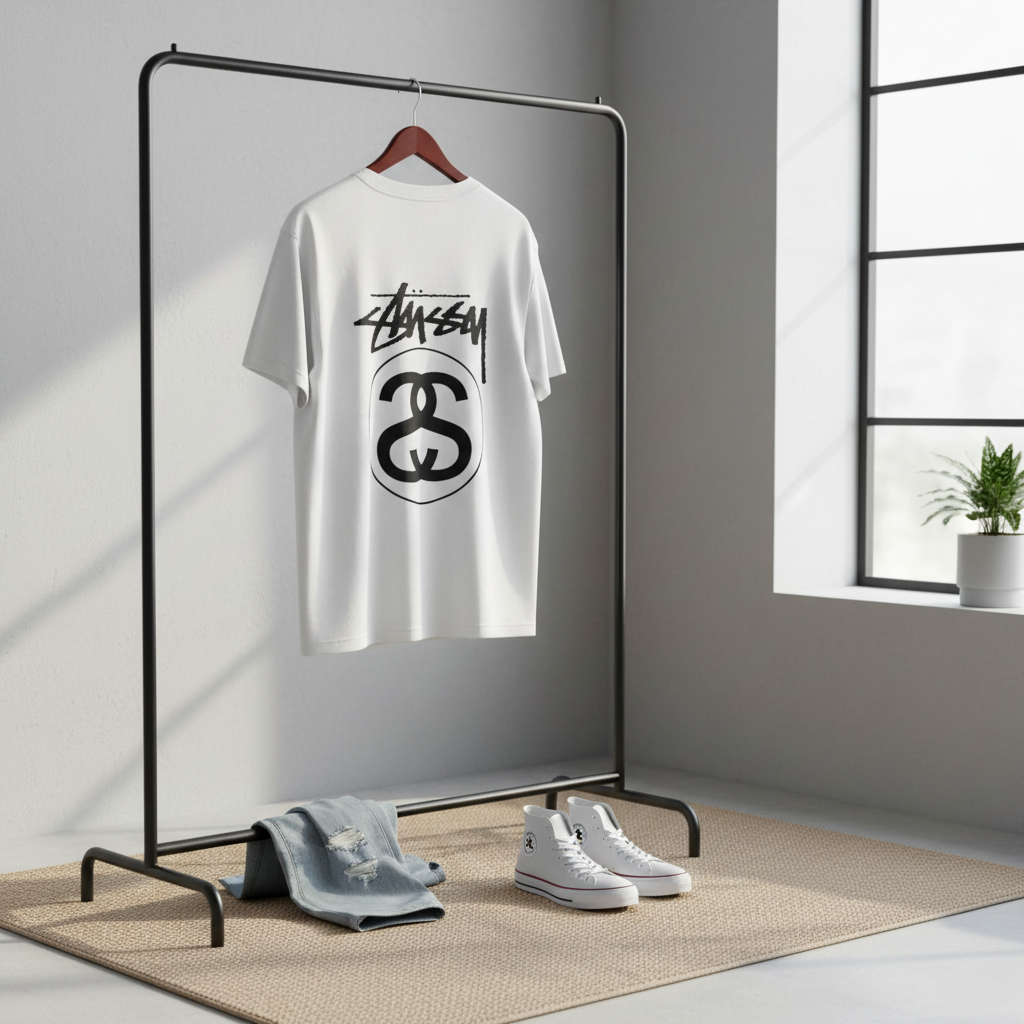 Stussy White Cotton T-Shirt with iconic signature and circular logo print on back, soft breathable fabric, unisex streetwear style for casual everyday fashion.
