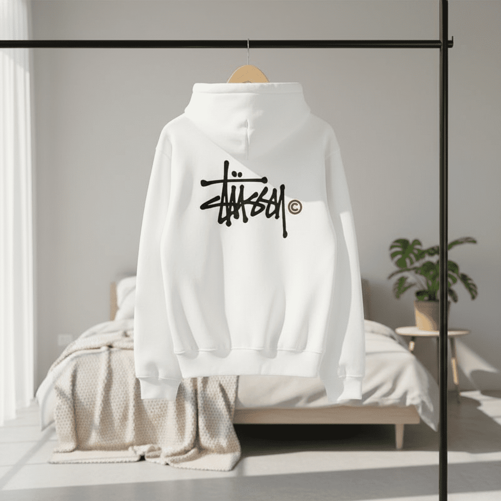 Stussy White Hoodie, crafted from premium cotton for softness and breathability. Features adjustable drawstring hood, signature graffiti logo on back, unisex design, perfect for casual streetwear style.