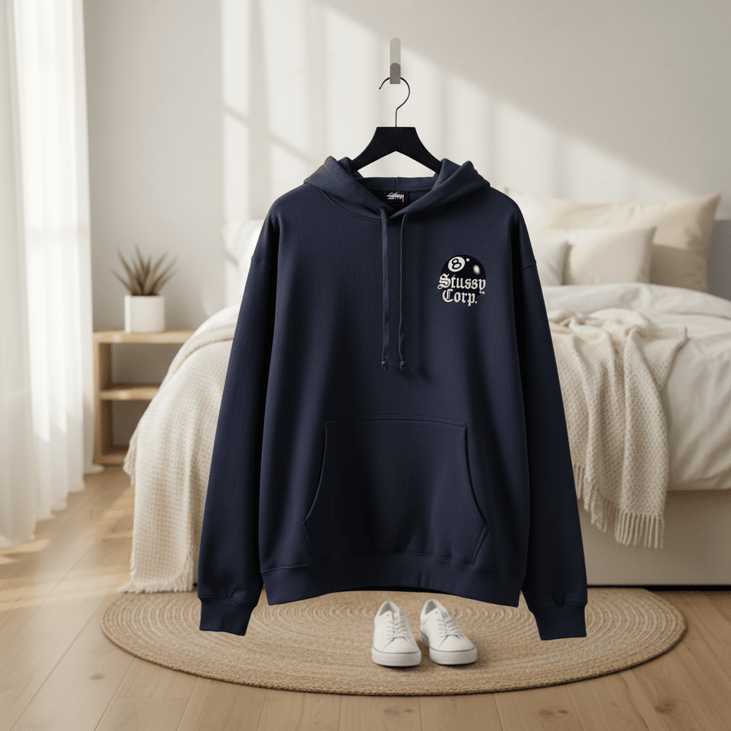 Stussy Corp Navy Hoodie – made from premium soft cotton, featuring drawstring hood, kangaroo pocket, front logo and iconic 8-ball graphic. Unisex streetwear style perfect for everyday casual outfits.