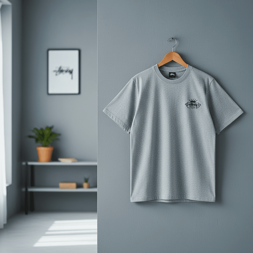 Stussy gray cotton T-shirt, soft and breathable, features crown logo on chest and bold back graphic with iconic graffiti font. Unisex loose fit, streetwear style for daily casual comfort.