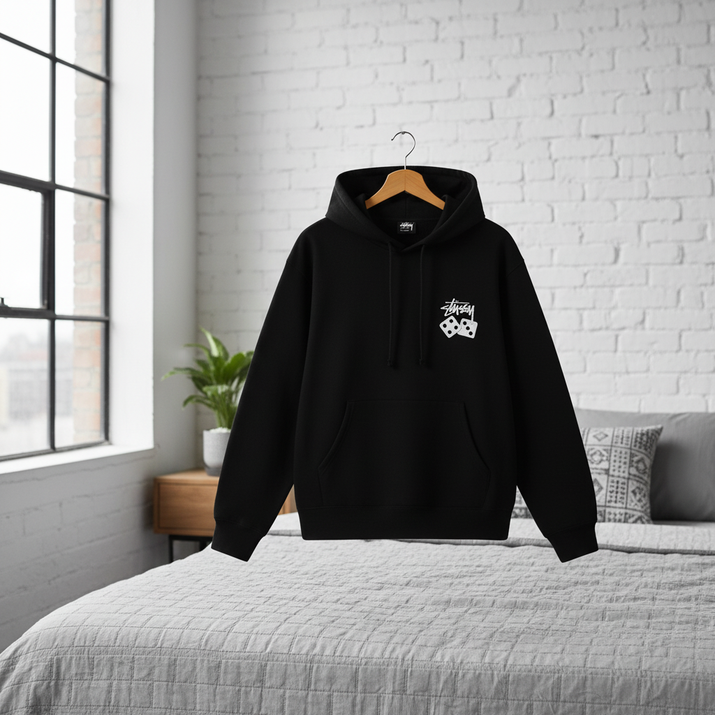 Stussy black cotton hoodie features front logo and dice graphic, bold graffiti-style Stussy lettering on back, adjustable drawstring hood, unisex design for streetwear comfort and style.