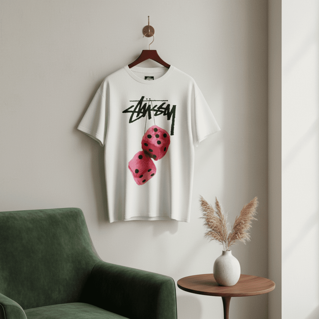 Stussy White Dice Print T-Shirt, soft breathable cotton, features black hand-drawn logo and pink dice graphic, streetwear unisex style, ideal for casual wear with a bold trendy look.