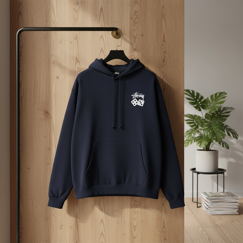 Stussy Navy Hoodie, crafted from soft breathable cotton, features drawstring hood, kangaroo pocket, graffiti logo with dice print, unisex streetwear style perfect for daily casual outfits.