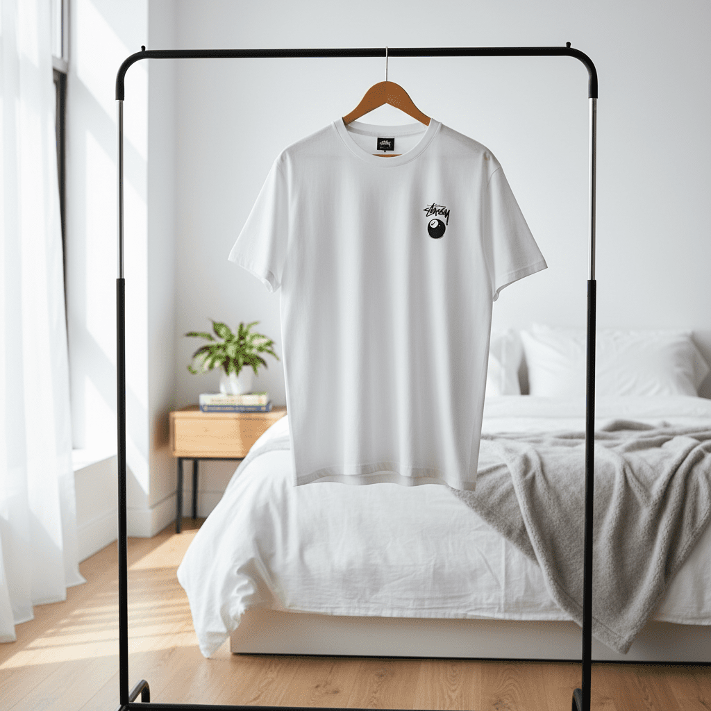Stussy White 8-Ball Graphic T-Shirt, made from premium cotton for soft, breathable comfort. Features signature Stussy logo and graphic front and back. Unisex streetwear for daily casual style.