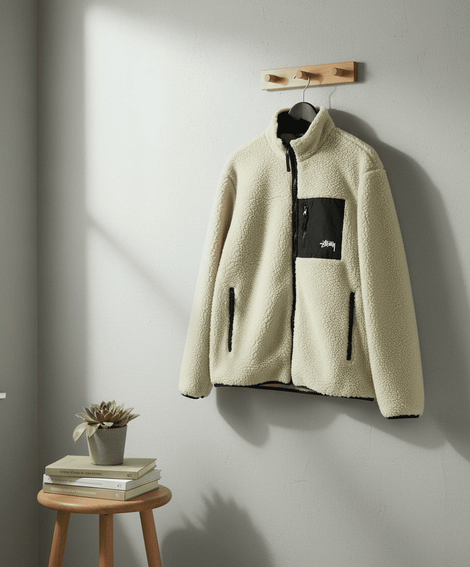 Stussy Classic Off-White Sherpa Fleece Jacket with stand collar, zip front, black pocket logo design, streetwear style, soft cozy unisex retro look for daily casual wear.