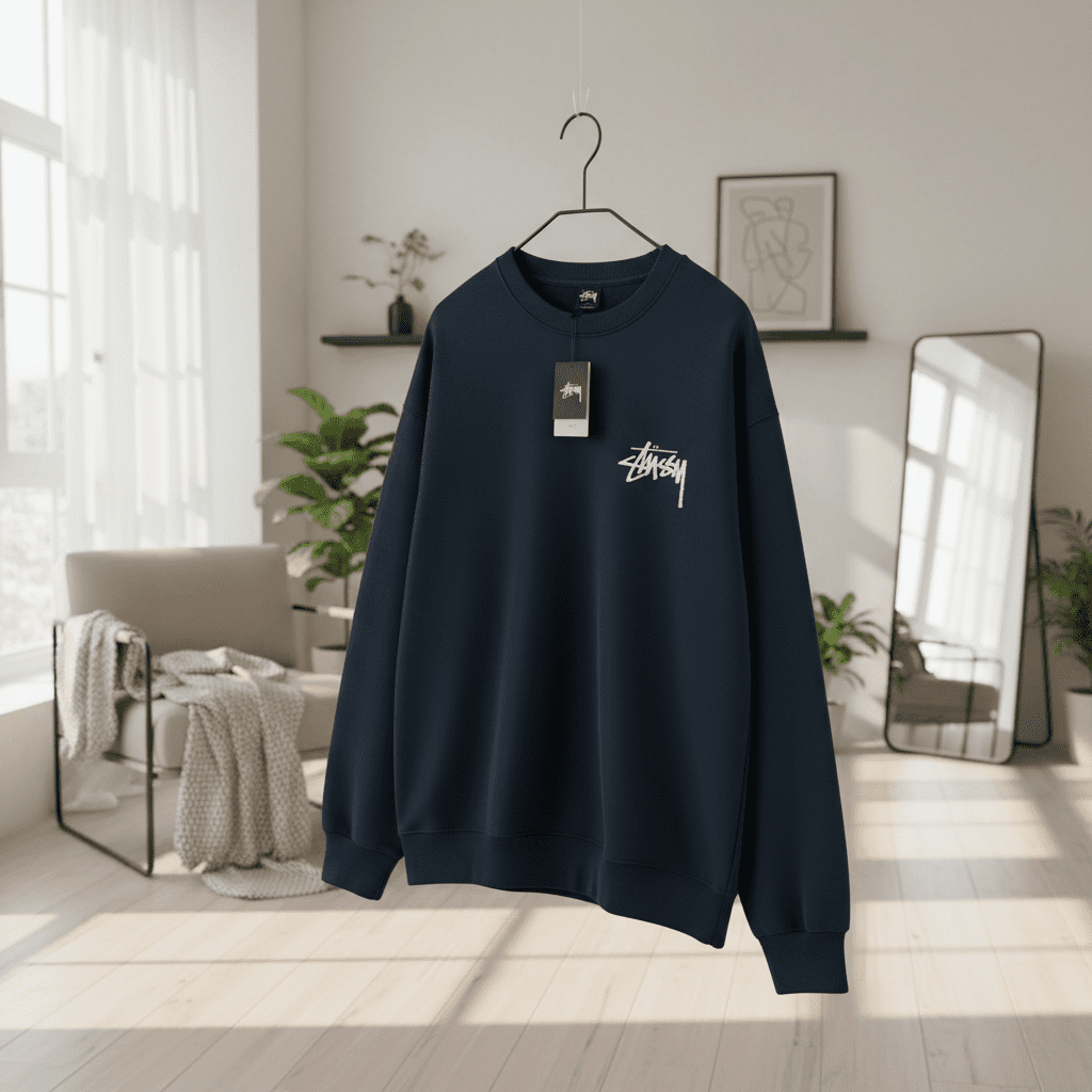Stussy Dark Blue Cotton Crewneck Sweatshirt with graffiti logo on chest and black-white reflection graphic on back, unisex street style, casual, comfortable, and uniquely trendy.