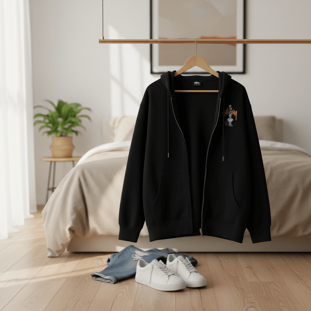 Stussy Black Zip Hoodie made of premium cotton, soft and breathable with chest logo print, bold back graphic, adjustable drawstring hood, unisex design, perfect for streetwear and casual style.