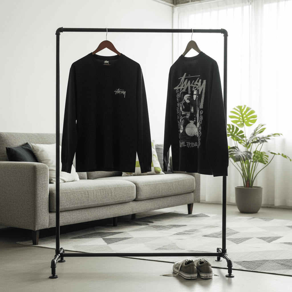 Stussy Black Street Long Sleeve T-Shirt, made from premium cotton for comfort and breathability, featuring a minimalist front logo and bold graffiti graphic on the back, unisex urban fashion style.