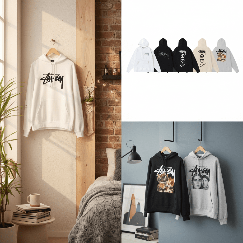 Stussy White Hoodie – Soft cotton fabric, adjustable drawstring hood, iconic graffiti logo on front, unisex streetwear design for daily casual wear, blending style and comfort perfectly.