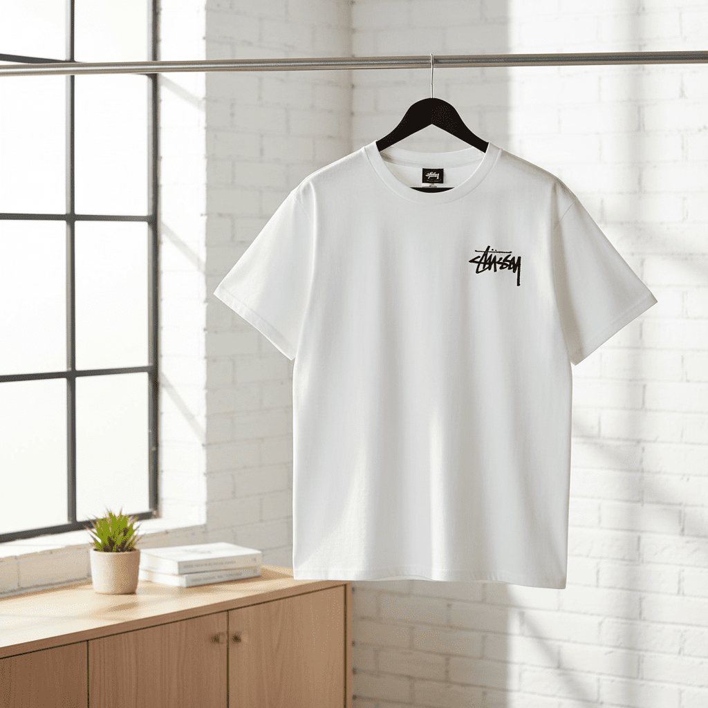 Stussy white cotton T-shirt, soft and breathable, features iconic graffiti logo on chest and pink-green street art graphic on back. Unisex loose fit for casual everyday style.