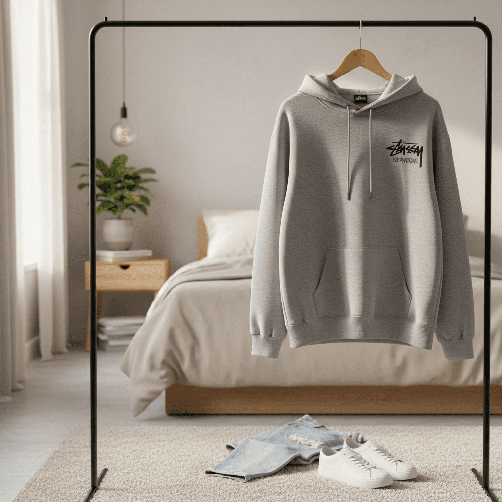 Stussy Classic Gray Hoodie, made of soft cotton fabric, features iconic graffiti logo, drawstring hood and kangaroo pocket. Unisex streetwear style, casual versatile for everyday fashion.