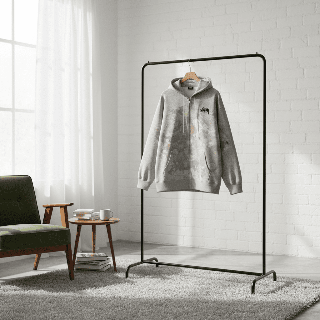 Stussy Gray Zip-Up Hoodie made of premium cotton, front minimal logo, colorful round back print, streetwear style, unisex design, warm, comfy, perfect for daily casual outfits.