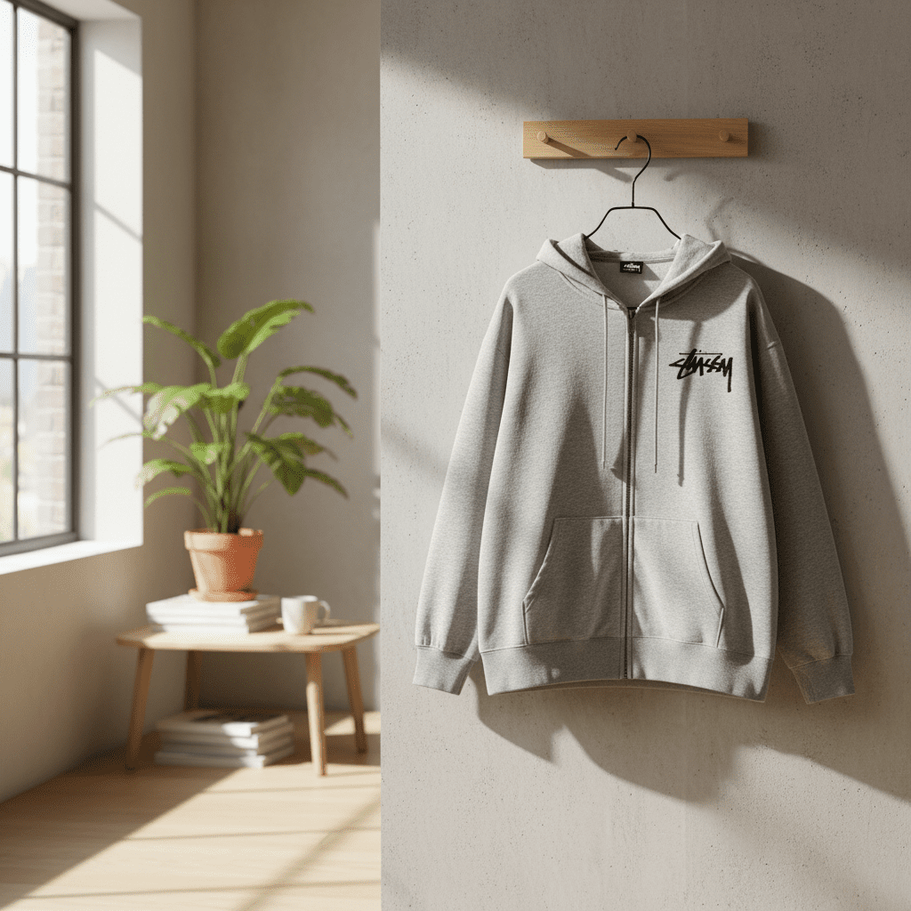 Stussy Grey Zip-Up Hoodie features soft cotton fabric, classic graffiti logo on front and sleeve, shattered glass graphic on back, unisex streetwear for daily casual style.