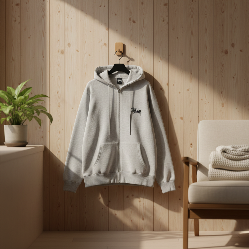 Stussy Light Grey Zip Hoodie, made of breathable cotton, features signature graffiti logo, adjustable drawstring hood, zip closure, kangaroo pocket, unisex design for everyday street style.