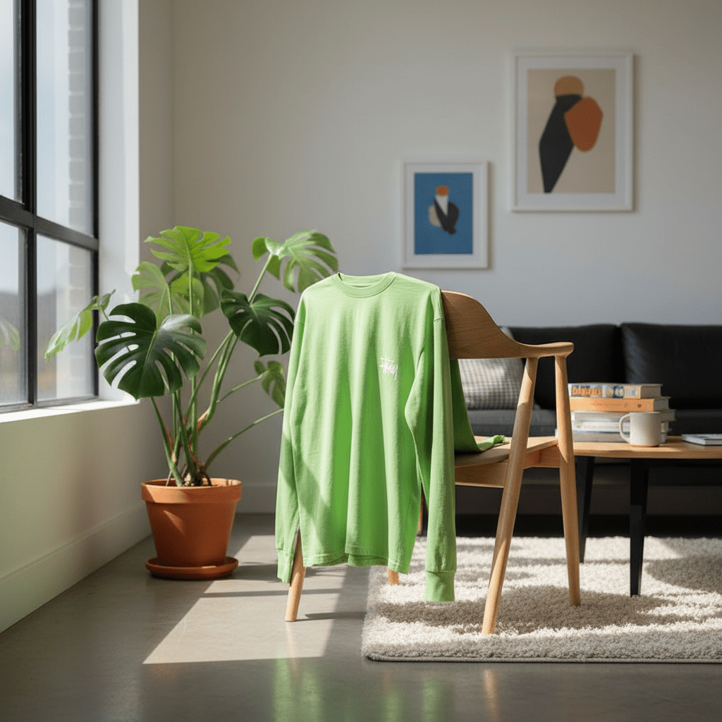 Stussy Fluorescent Green Long Sleeve T-Shirt, soft cotton fabric, front logo, back graffiti print, streetwear style, unisex design, comfy and versatile for daily casual fashion.