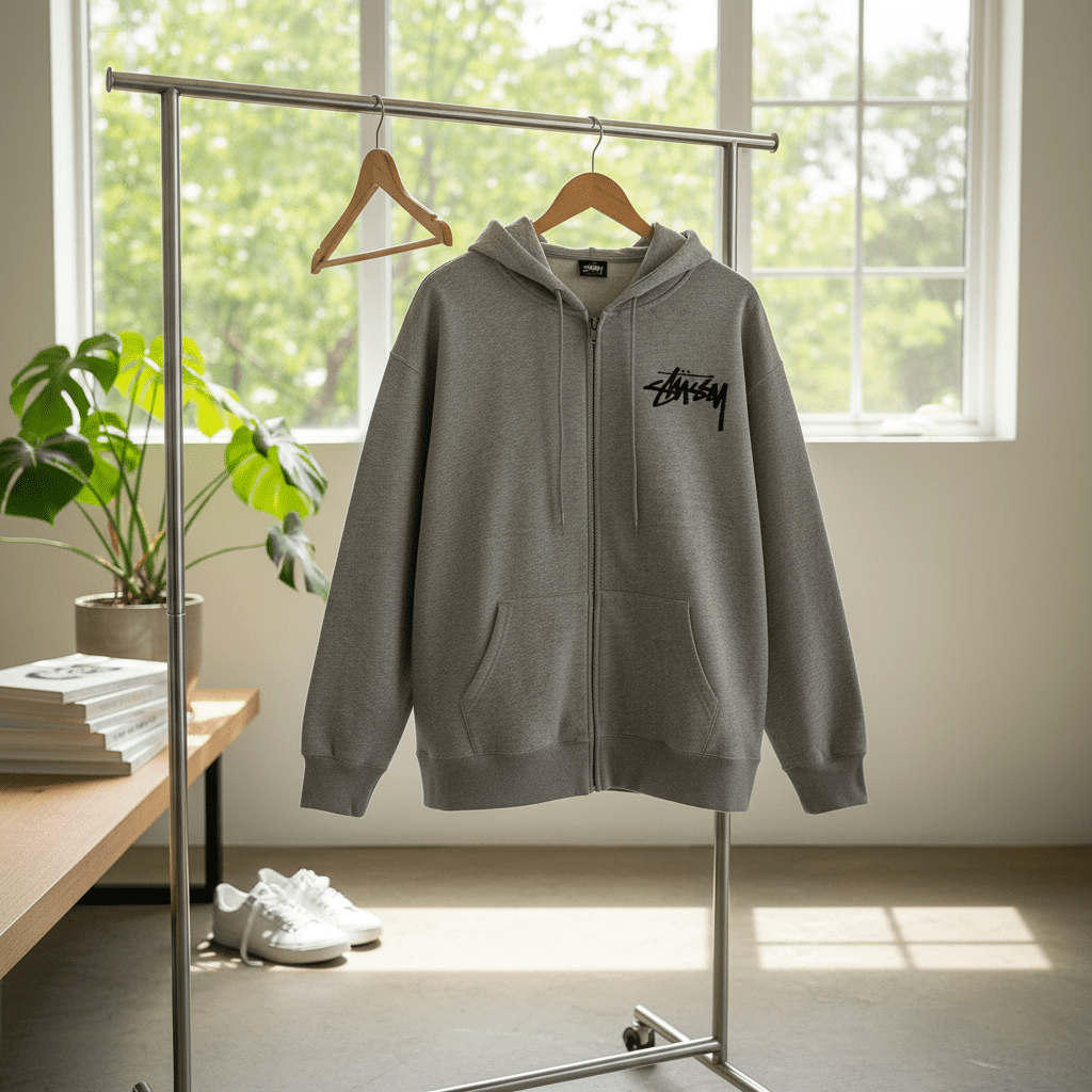 Stussy Grey Zip Hoodie, premium cotton for soft warmth, front signature logo, back shattered glass graphic, unisex streetwear style, perfect for daily casual and trendy outfits.