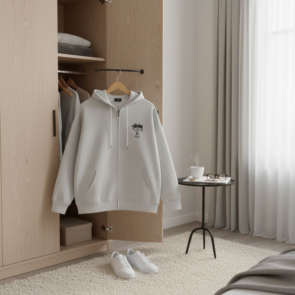 Stussy Grey Zip Hoodie made of soft breathable cotton, front logo and back totem print, unisex streetwear style, casual and comfortable, perfect for daily wear with iconic brand vibe.