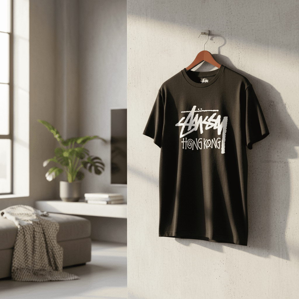 Stussy Classic Black T-Shirt made of breathable cotton, featuring iconic graffiti logo with Hong Kong graphic. Unisex streetwear style for casual daily outfits with attitude.