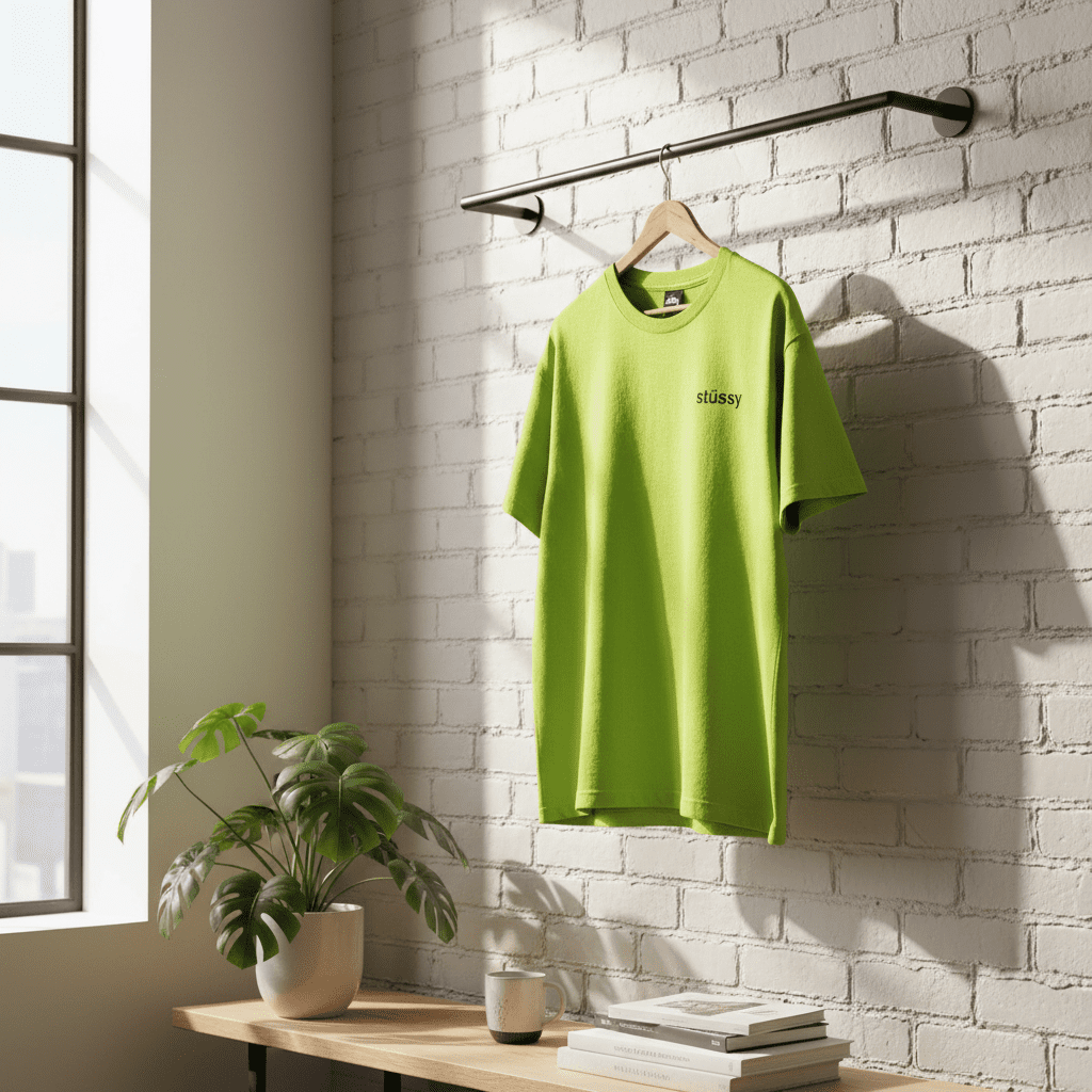Stussy Fluorescent Green T-Shirt, premium cotton fabric, front mini logo, back blue popsicle graphic, unisex streetwear style, comfortable and stylish for daily casual wear.