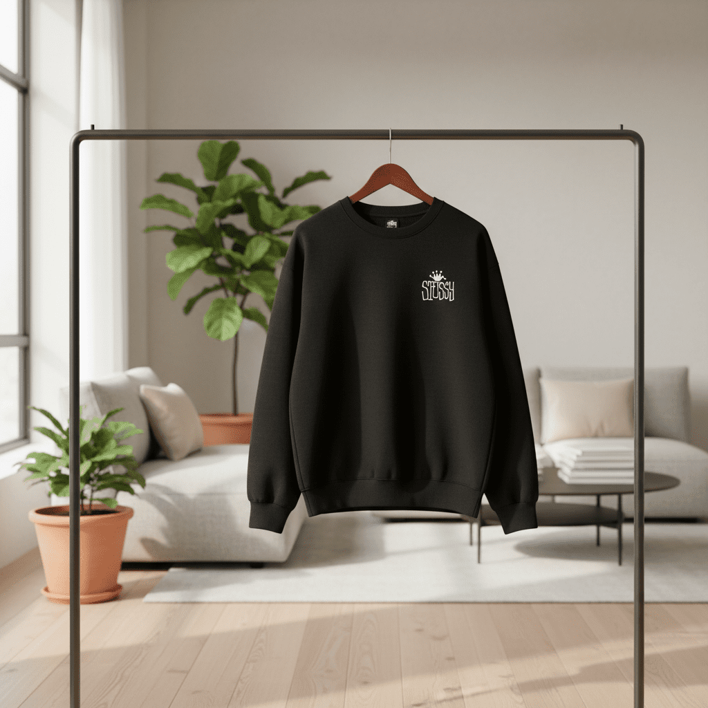 Stussy International Crew black sweatshirt, soft cotton fabric, front logo with crown and lettering on back, unisex streetwear style, perfect for casual daily comfort and fashion.