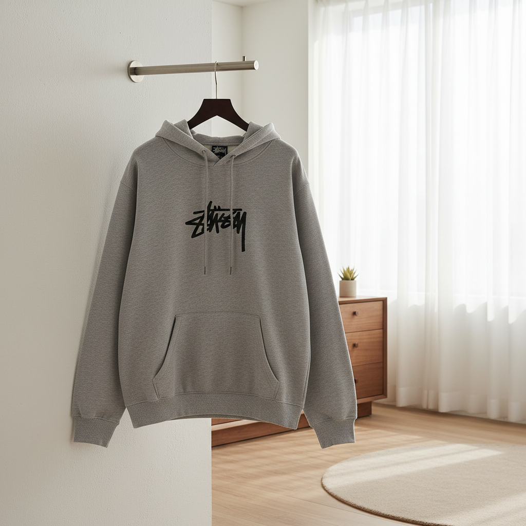 Stussy Light Gray Hoodie, made from soft breathable cotton, features iconic black graffiti logo, drawstring hood, and kangaroo pocket. Unisex streetwear for casual, trendy everyday style.