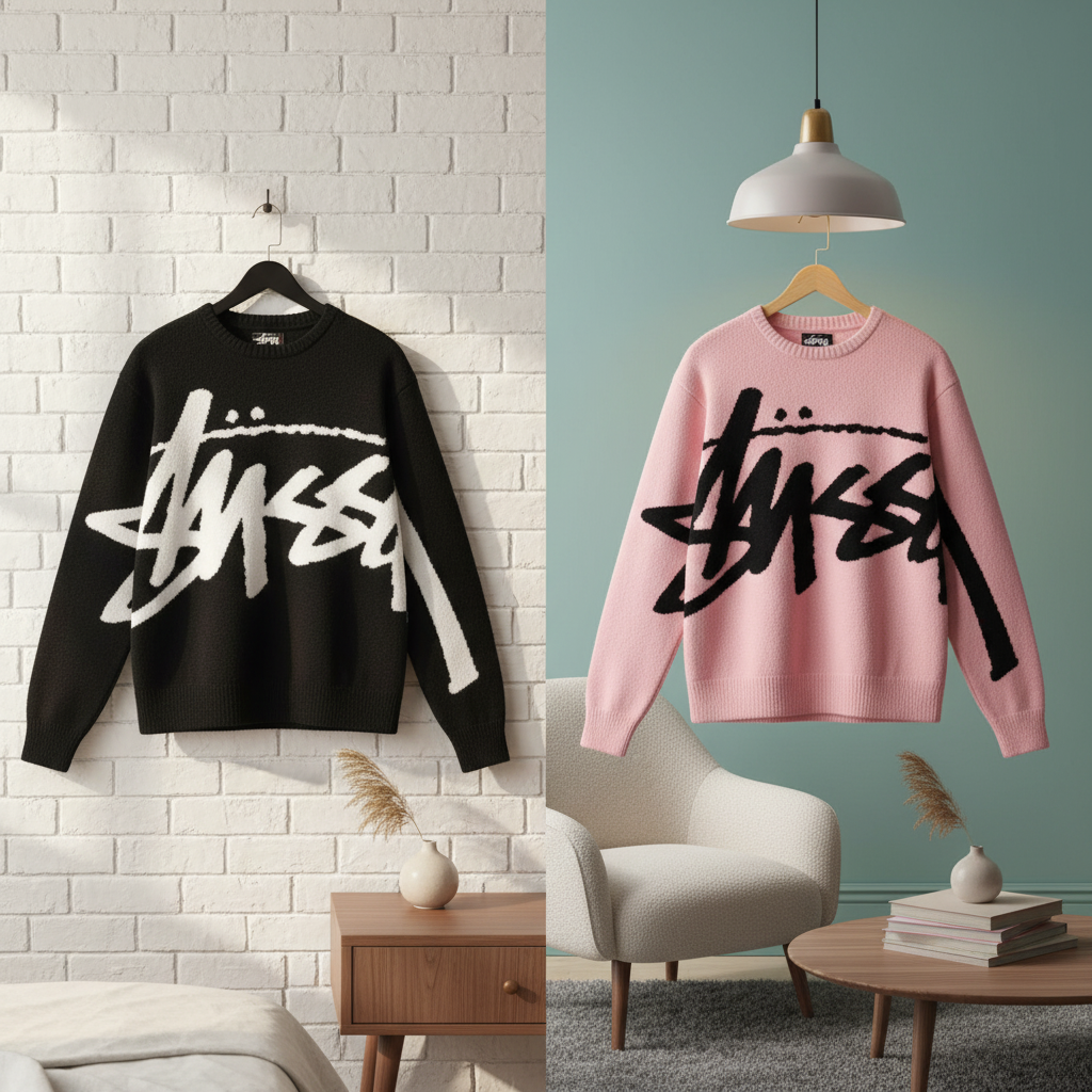 Stussy Classic Knit Sweater, made from soft warm fabric, features iconic graffiti logo at the back. Unisex streetwear inspired by 80s heritage, perfect for daily casual style.