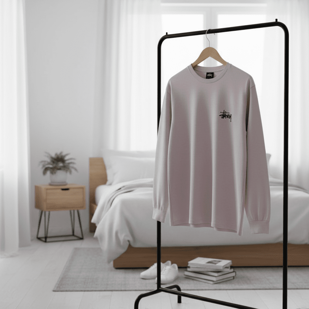 Stussy Pink Long Sleeve T-Shirt made from soft breathable cotton, featuring small front logo and bold back graffiti print. Unisex streetwear style perfect for casual everyday looks.