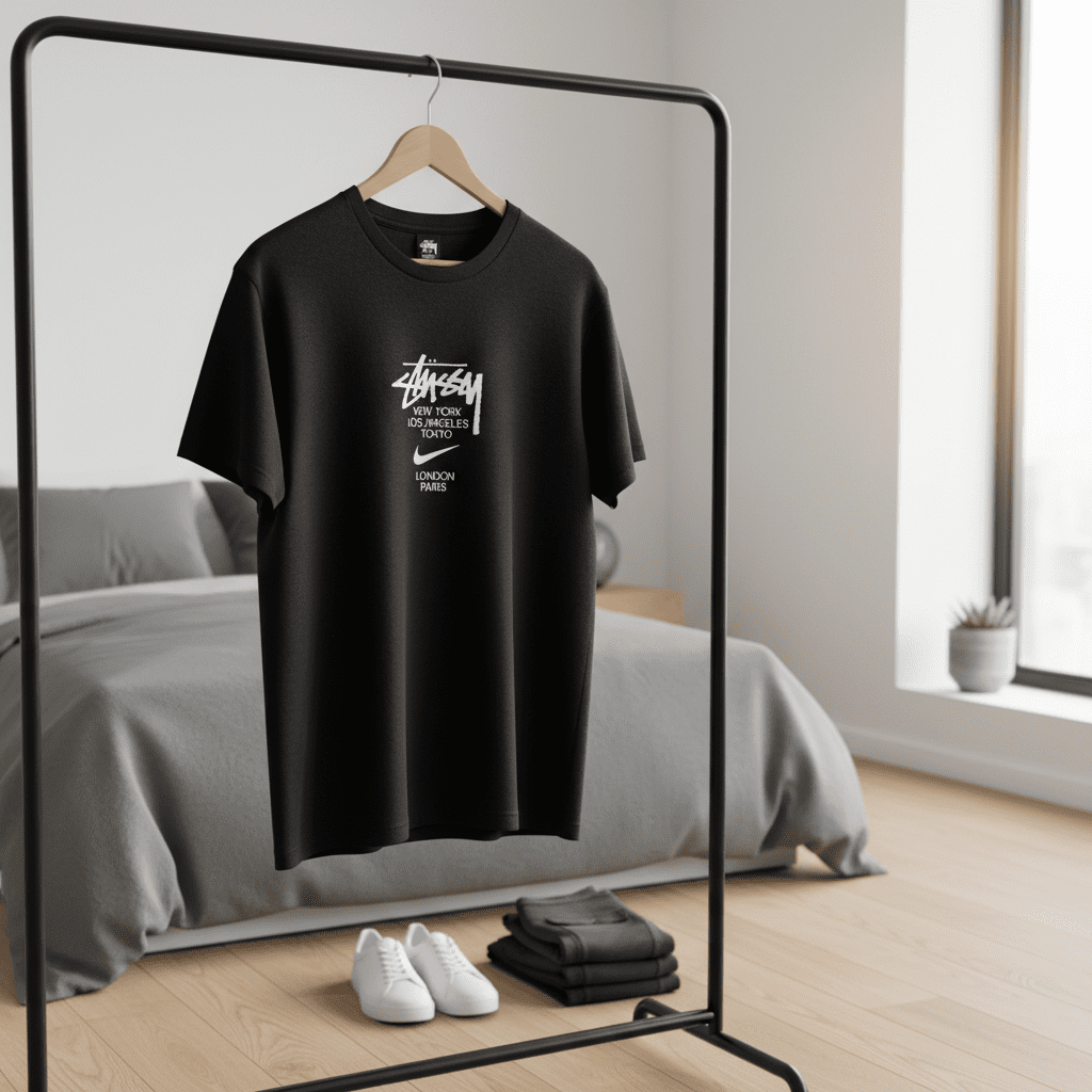 Stussy x Nike Black T-Shirt, made from premium breathable cotton, features iconic graffiti logo and city print design, streetwear style for men and women, perfect for casual everyday wear.