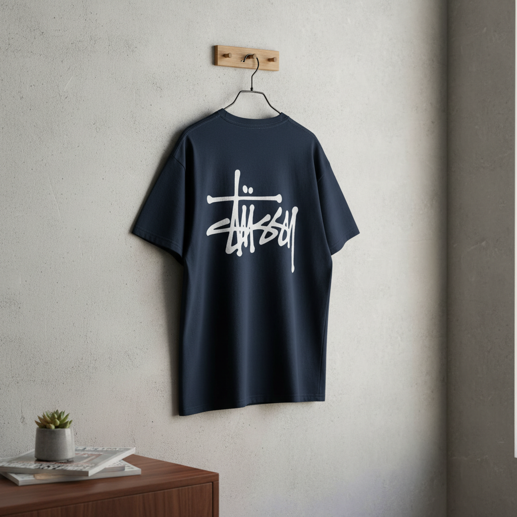 Stussy Deep Blue Cotton T-Shirt, breathable and comfortable, featuring iconic white graffiti-style logo on back, streetwear design for men and women, perfect for daily casual fashion.