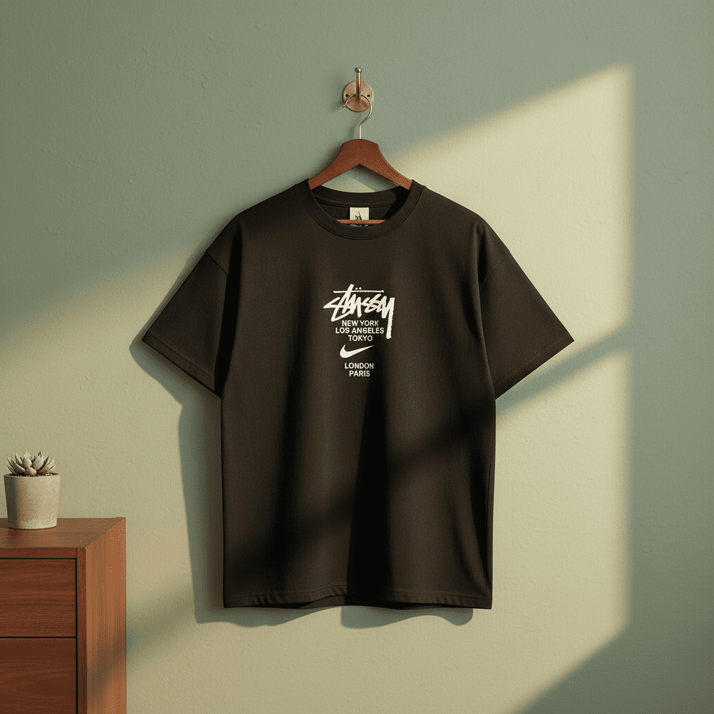 Stussy x Nike black cotton T-shirt featuring graffiti-style logos and city names. Soft, breathable fabric for comfort and unisex streetwear style, perfect for everyday casual fashion.