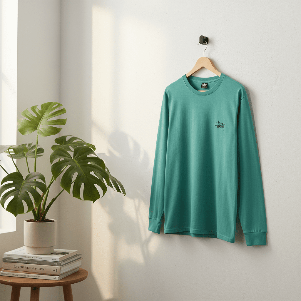 Stussy Mint Green Long Sleeve T-Shirt made of premium soft cotton, features small chest logo and bold graffiti back print. Classic crew neck unisex design for streetwear and casual everyday style.