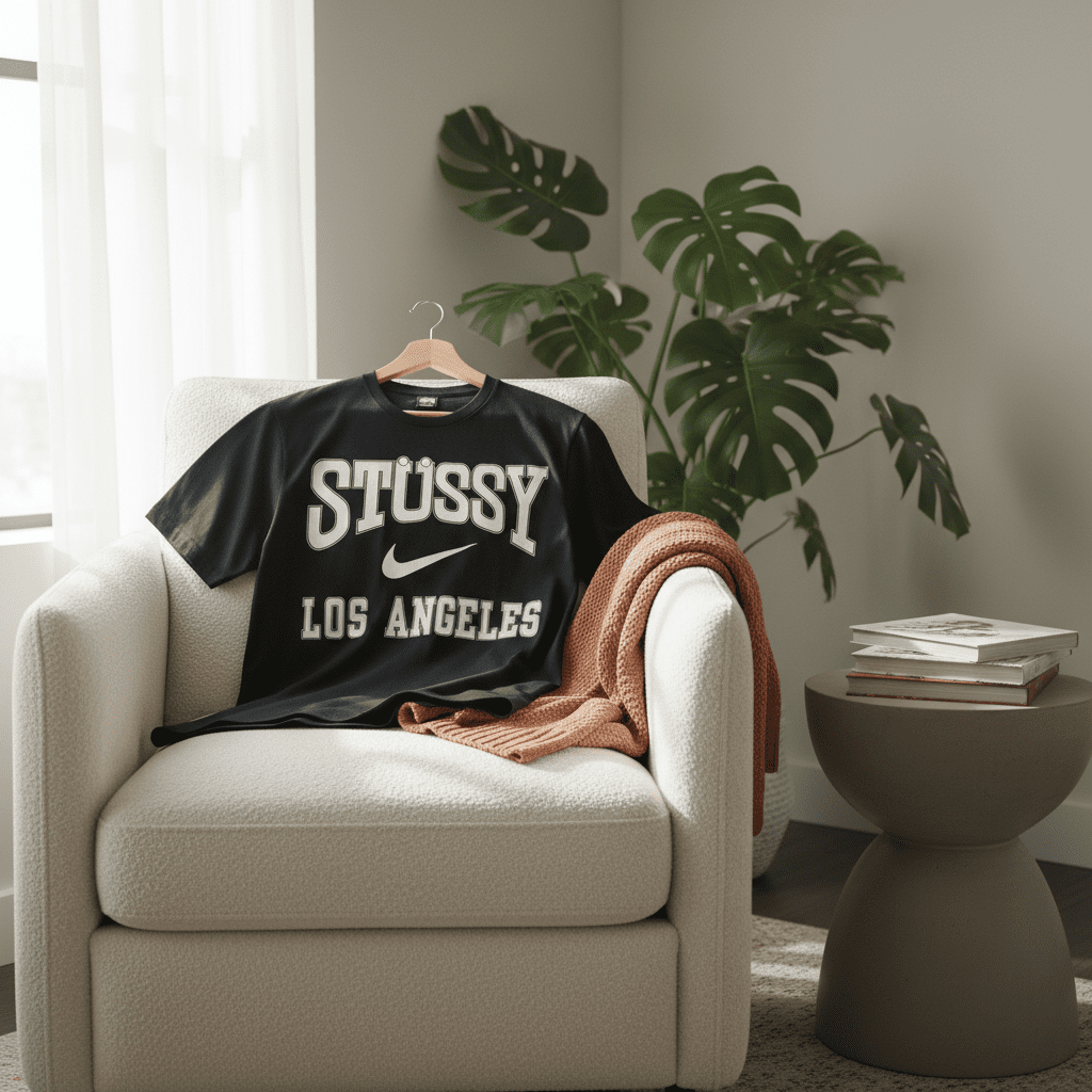 Stussy x Nike Black T-Shirt, premium breathable cotton, front white Stussy logo, Nike swoosh, and Los Angeles print, streetwear style for men and women, perfect for daily casual wear.