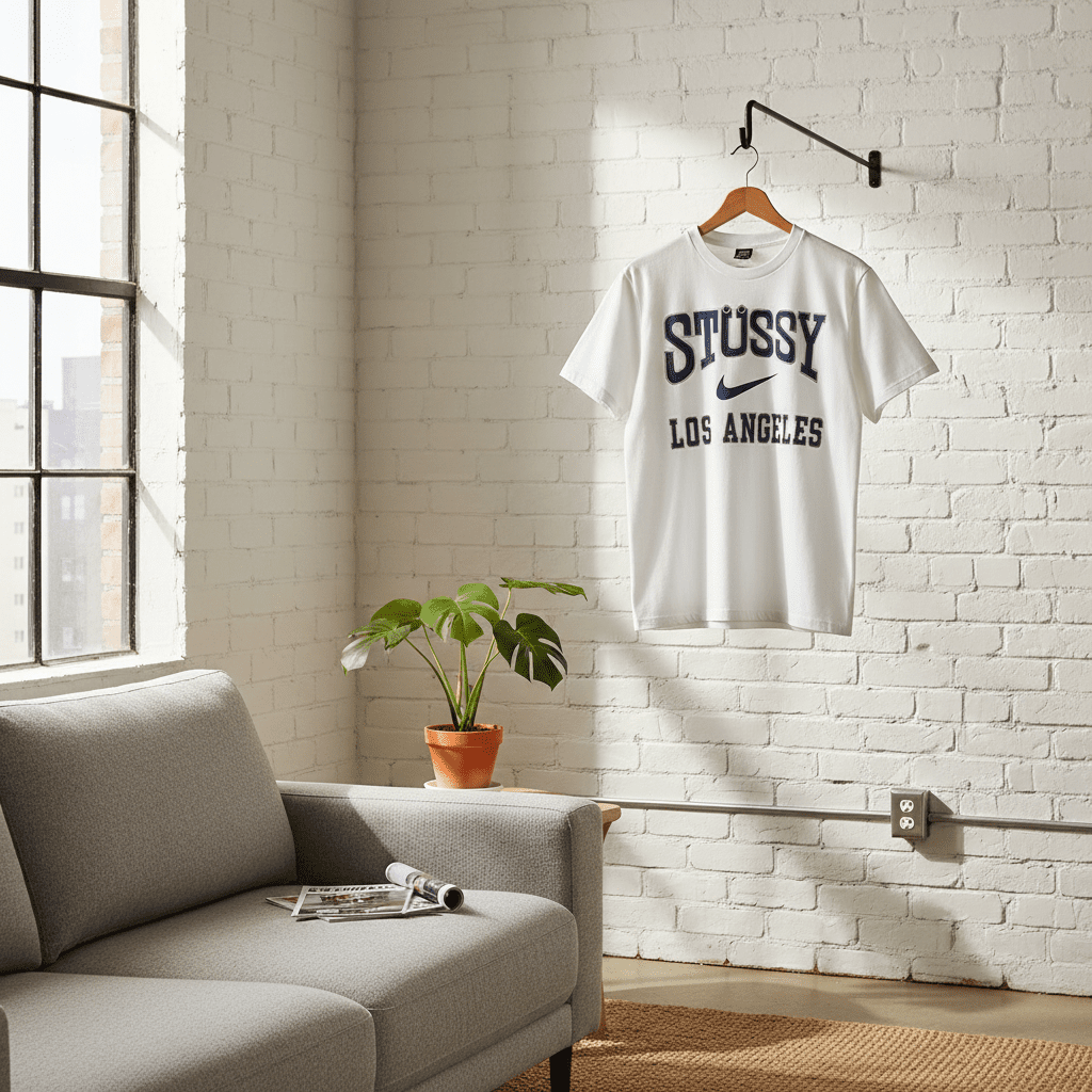Stussy x Nike White T-Shirt, breathable soft cotton fabric, navy logo print with Los Angeles lettering, unisex streetwear style perfect for casual daily outfits.