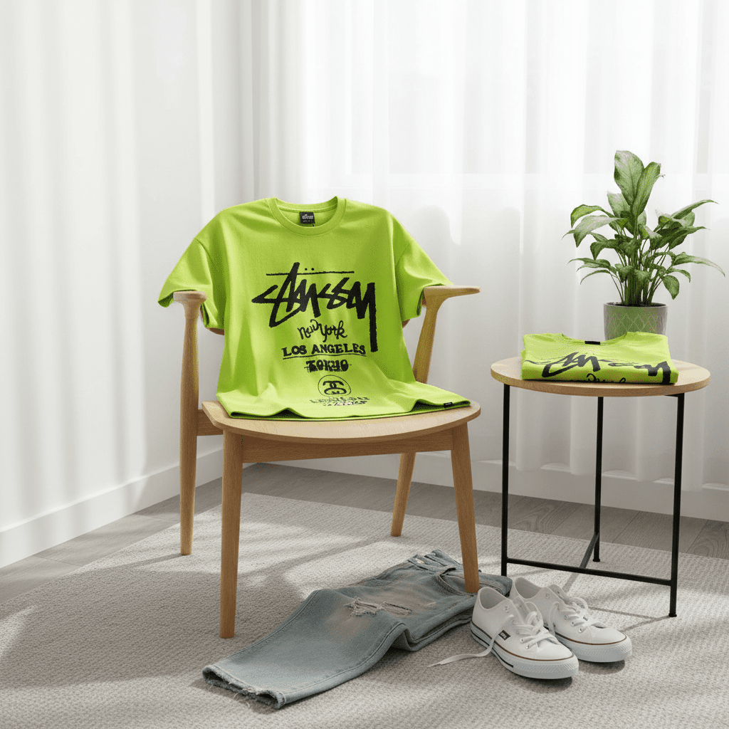 Stussy Fluorescent Green Street Style T-Shirt, made of premium breathable cotton, features signature graffiti and city totems front and back, unisex design, perfect for trendy casual wear.
