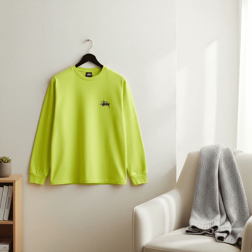 Stussy Classic Neon Green Long Sleeve T-Shirt, soft breathable cotton, front mini logo & back graffiti print, unisex streetwear style for daily casual outfits with bold urban attitude.