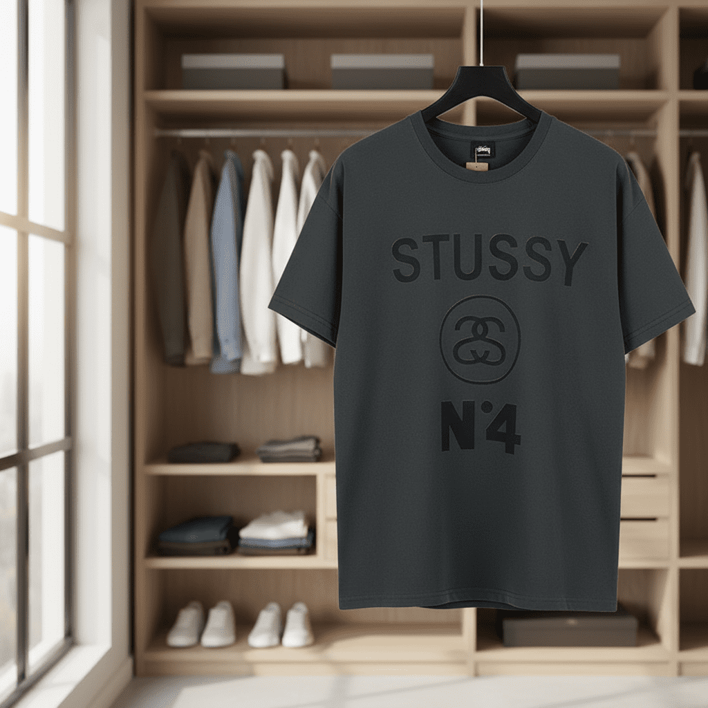Stussy Dark Gray Cotton T-Shirt, breathable and soft fabric, features iconic Stussy logo, double S emblem and N4 design, unisex streetwear style with classic crew neck for casual everyday wear.