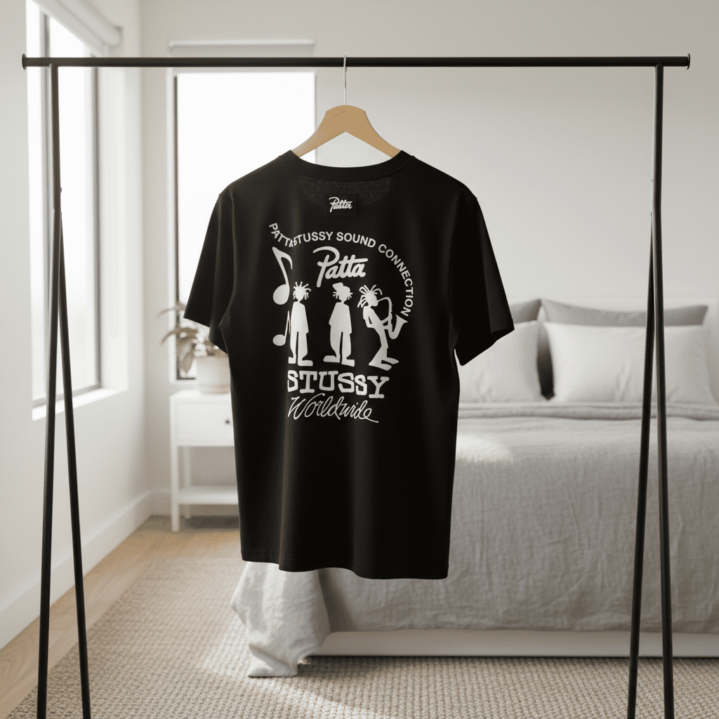 Stussy x Patta Sound Connection Black T-Shirt, soft breathable cotton, cartoon silhouette and music note print, streetwear unisex style for casual daily outfits with bold urban vibe.