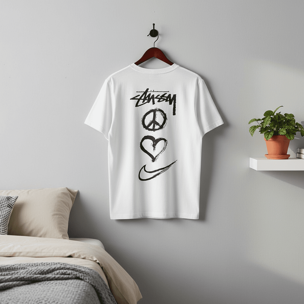 Stussy White Street Style T-Shirt made of premium cotton, soft and breathable. Features graffiti-style Stussy logo, peace sign, heart and swoosh graphic. Unisex design for casual daily wear.