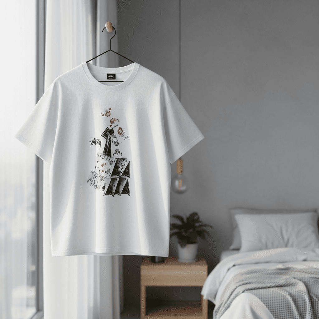 Stussy White Playing Card Graphic T-Shirt, made of premium breathable cotton, features creative stacked card print with logo, unisex streetwear style perfect for casual and trendy everyday looks.