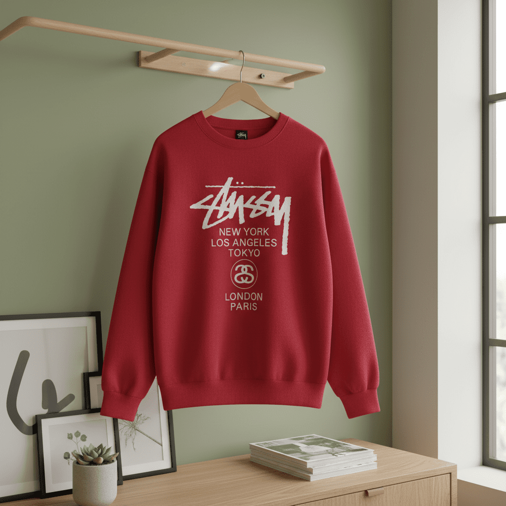 Stussy Red Crewneck Sweatshirt, made of soft breathable cotton, features graffiti logo with city names and brand print on back. Unisex streetwear style for casual and comfortable daily outfits.
