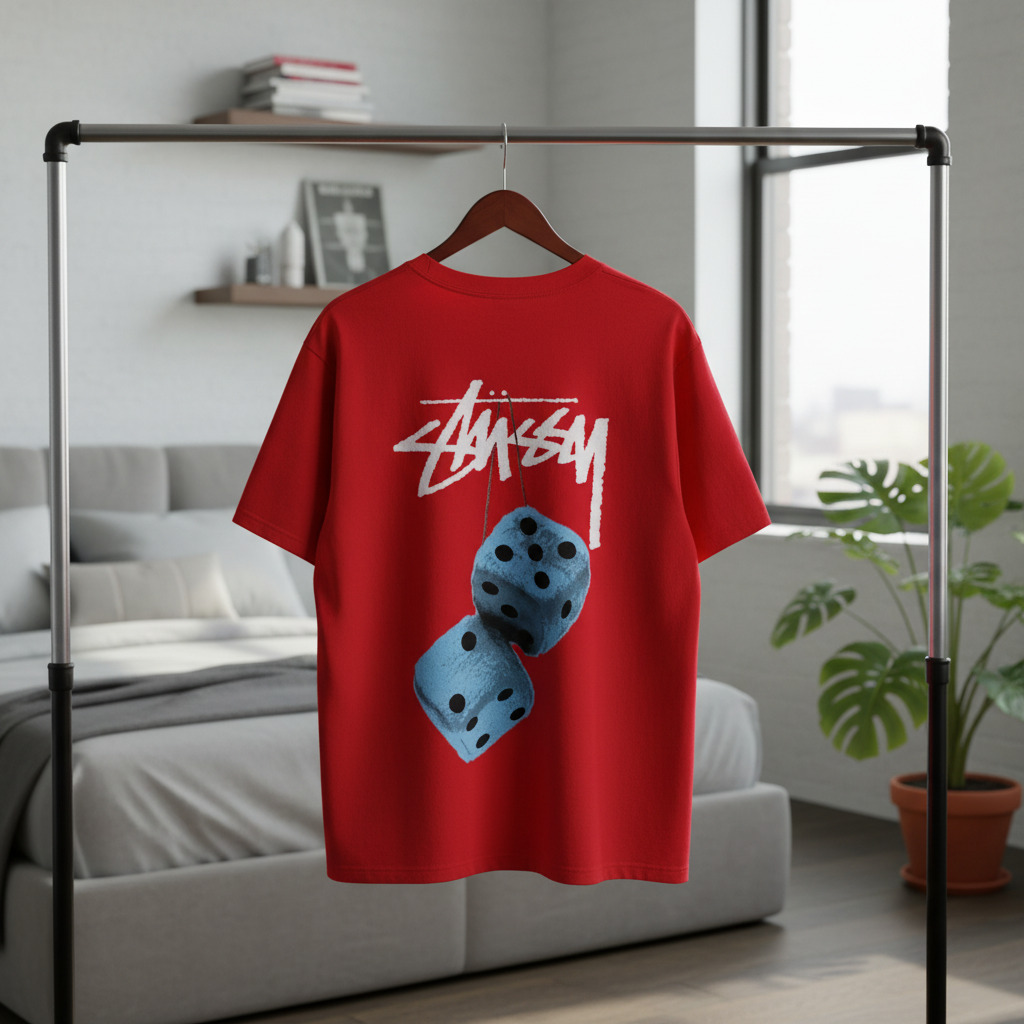 Stussy Red Dice Graphic T-Shirt – made from premium cotton for comfort and breathability. Features iconic graffiti logo and dice print. Unisex design for trendy streetwear and casual style.