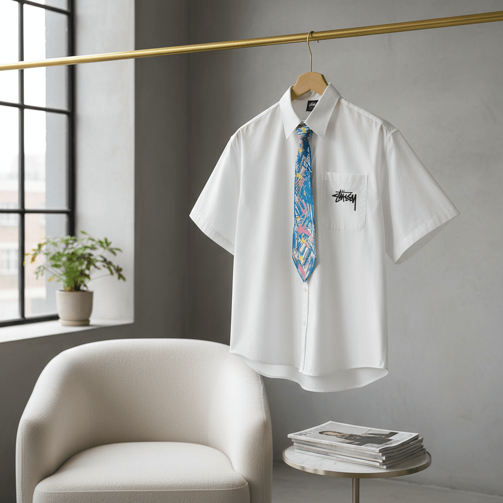 Stussy White Cotton Short Sleeve Shirt with classic black hand-written logo on chest pocket and colorful graffiti tie, breathable and trendy unisex streetwear for daily casual style.