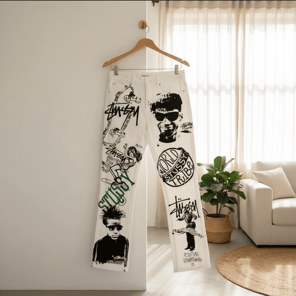 Stussy White Street Style Pants made from soft cotton, featuring bold graffiti prints, brand logos, and “World Stussy Tribe” design. Unisex fit for casual comfort and standout urban fashion.