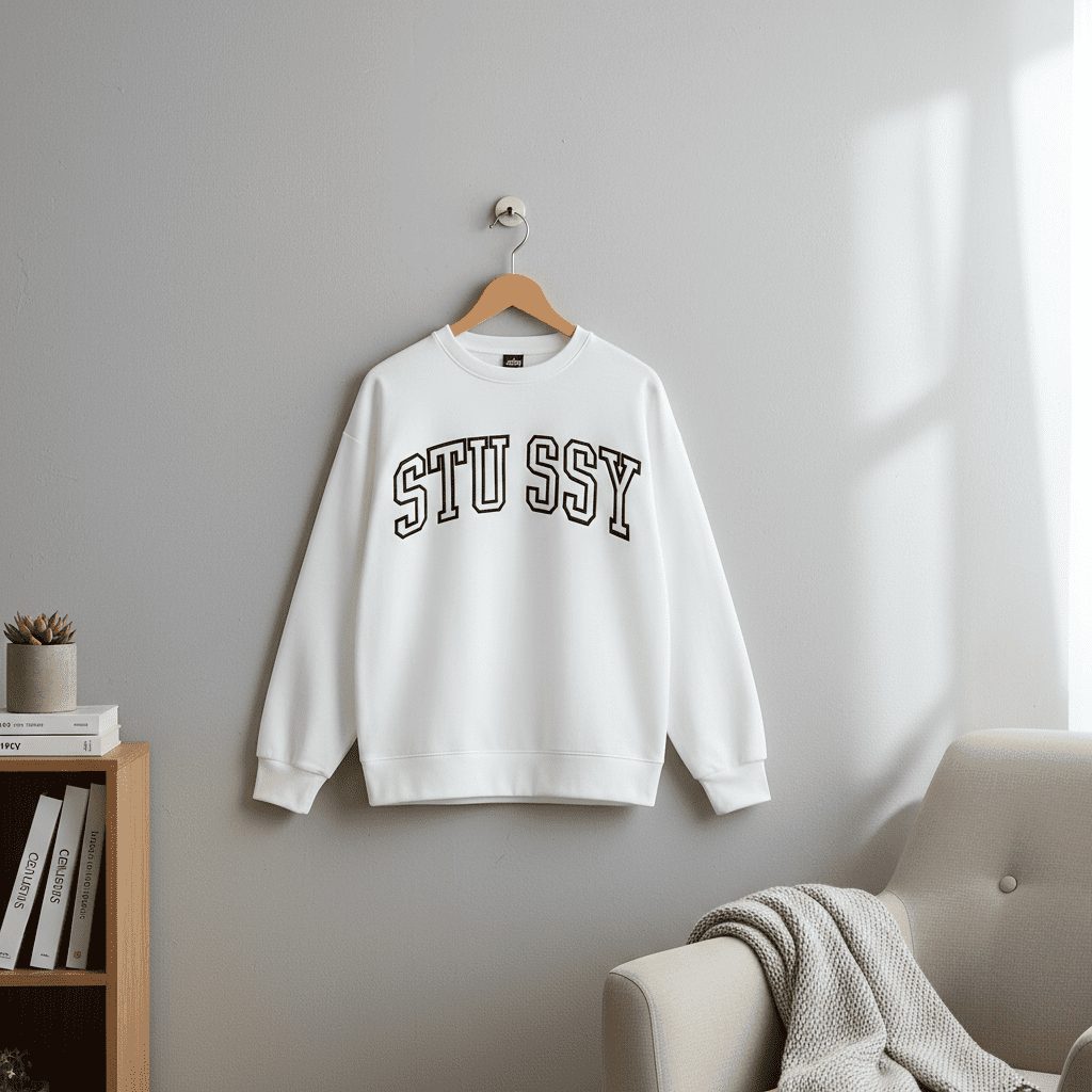 Stussy White Cotton Crewneck Sweatshirt – soft, breathable premium fabric with black STU SSY sporty logo print, unisex loose fit, streetwear style, simple versatile for daily casual comfort.