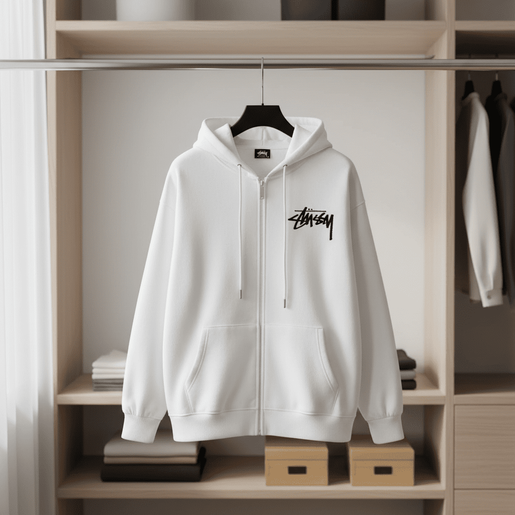 Stussy White Zip-Up Hoodie, soft cotton fabric for comfort, front hand-written logo, back shattered glass graphic. Streetwear style, unisex design, easy to wear, perfect for daily casual outfits.