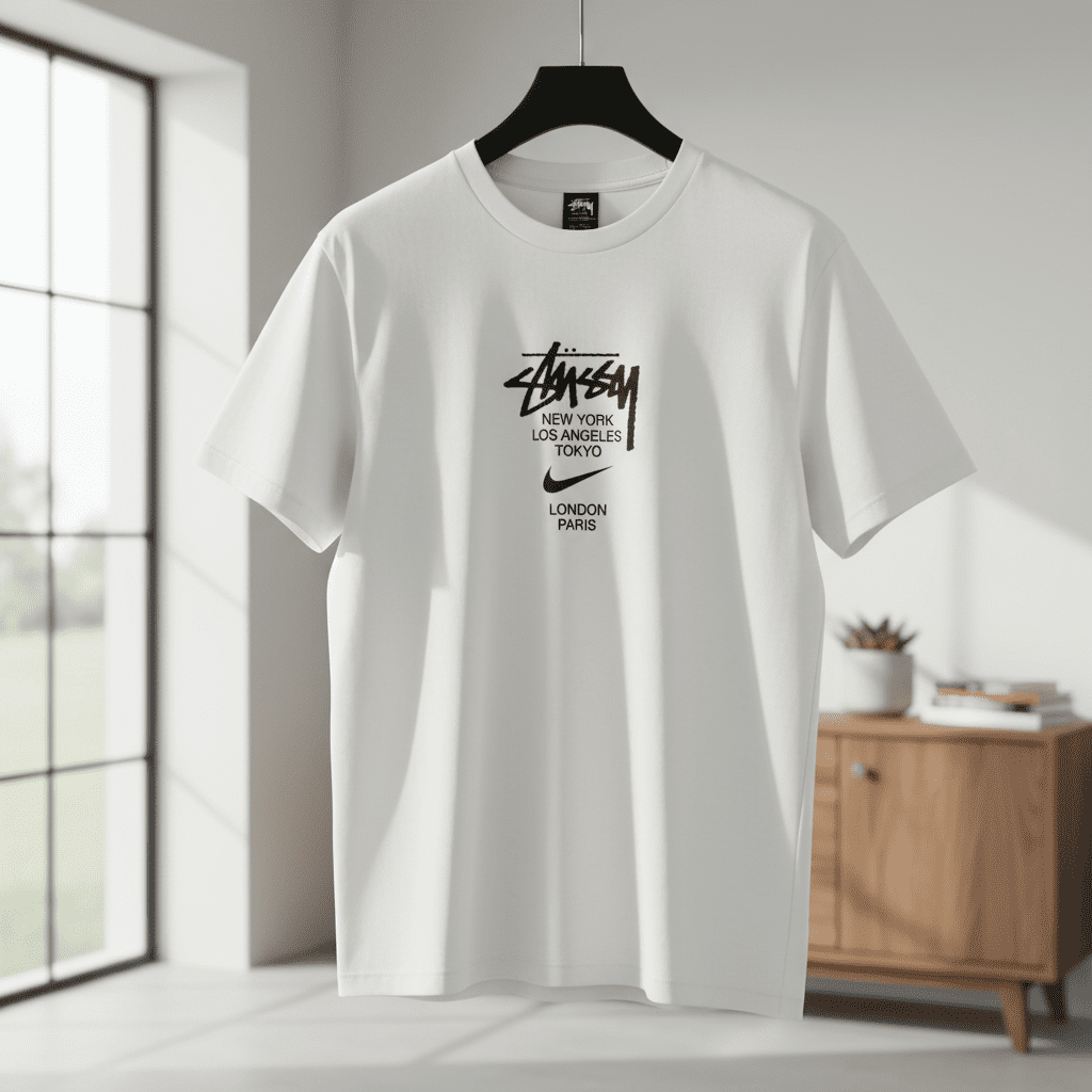 Stussy White Cotton T-Shirt featuring graffiti-style logo and city print. Soft, breathable fabric for all-day comfort. Unisex classic streetwear design, perfect for daily casual wear.