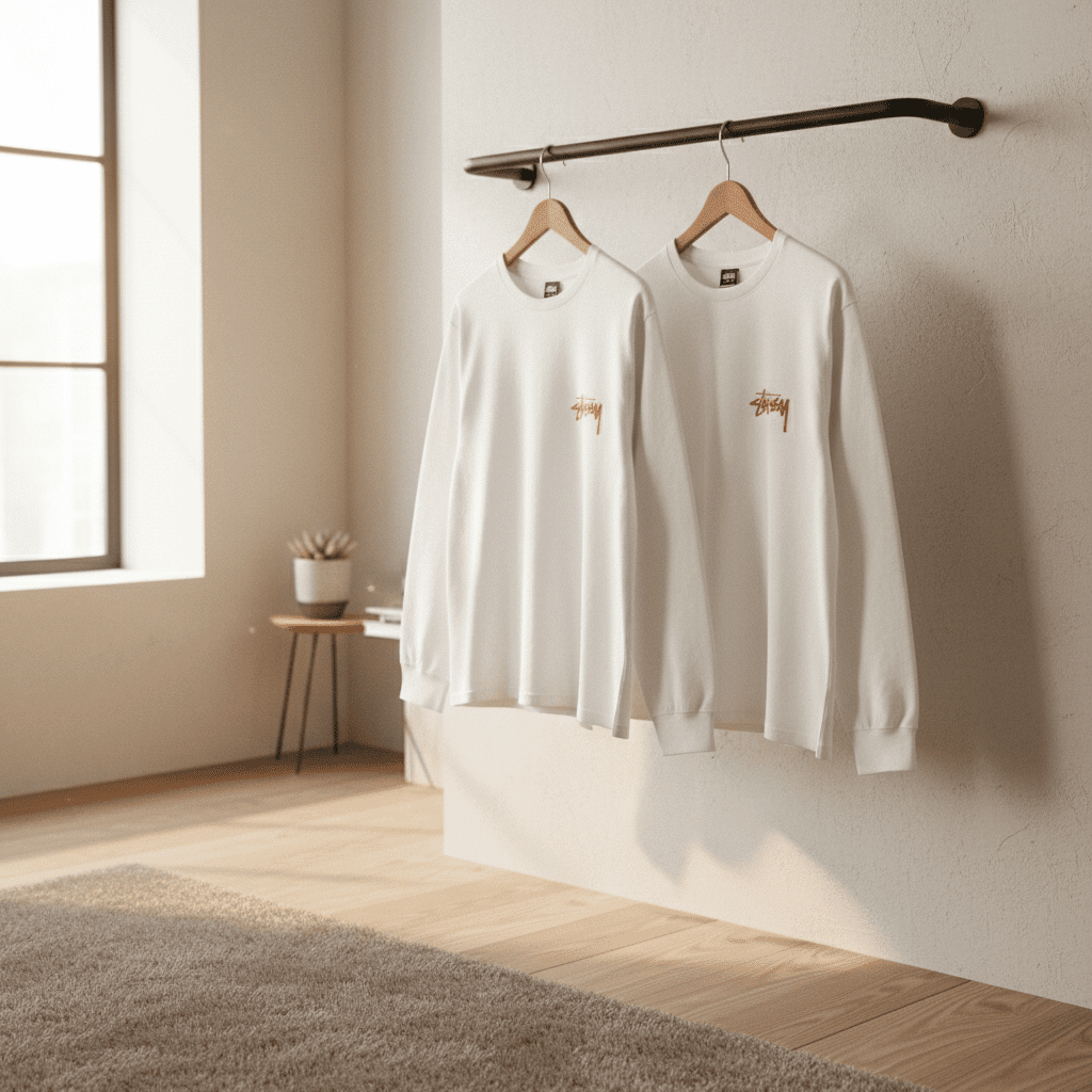 Stussy White Long Sleeve T-Shirt made of premium cotton, featuring red logo on front and black-and-white photo with red graphic on back, unisex streetwear style, comfy and versatile for everyday wear.