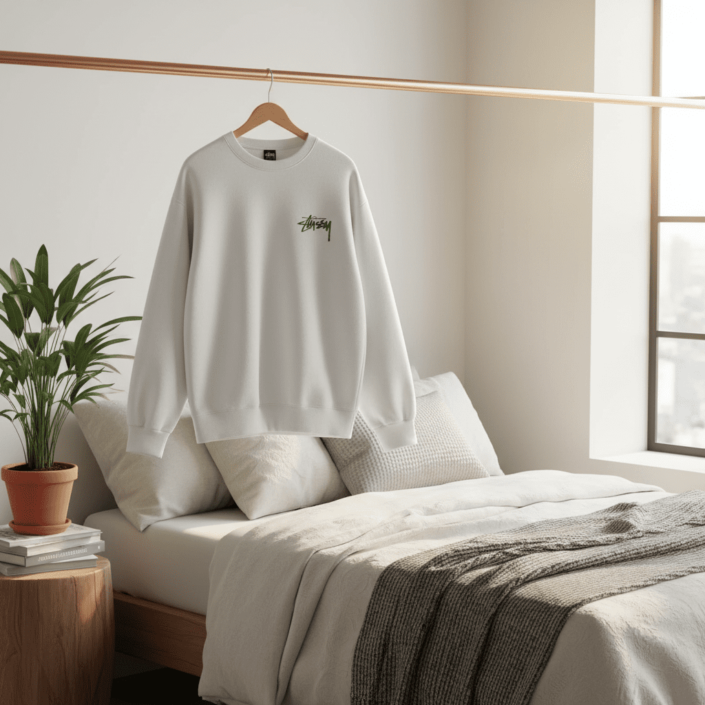 Stussy White Cotton Crewneck Sweatshirt, soft and breathable, features green logo on front and graphic print on back, unisex streetwear style for casual, comfortable, and trendy everyday outfits.