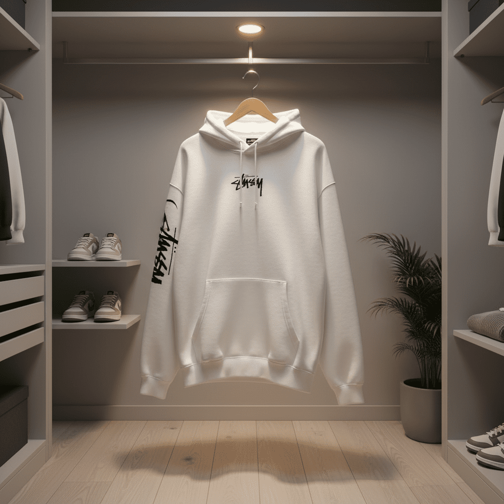Stussy White Street Style Hoodie – Soft cotton fabric, breathable and unisex. Features hand-drawn Stussy logo, peace symbol, heart and swoosh motif for a bold, casual and expressive look.